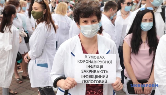 Як повідомляє кореспондент Укрінформу, на мітинг прийшли кілька десятків медиків з вимогою відновити фінансування цих лікарень та виплатити їм зарплату.