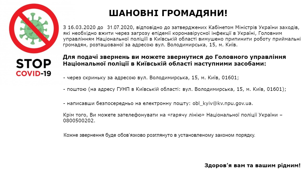 «У зв’язку із продовженням карантину, прийом громадян Головним управлінням Національної поліції тимчасово припинено до 31 липня 2020 року», — йдеться в повідомленні.