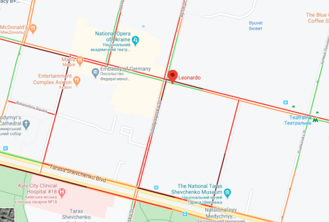 Біля метро Театральна рух поки вільний, без заторів. Вулиця Богдана Хмельницького стоїть до Національного музею медицини.