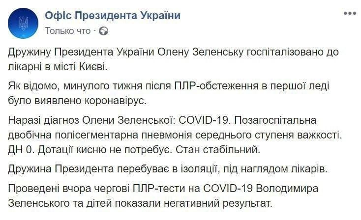 "Сейчас диагноз Елены Зеленской: COVID-19. Внегоспитальная двусторонняя полисегментарная пневмония средней степени тяжести. ДН 0. В дотации кислорода не нуждается. Состояние стабильное", — говорится в сообщении.