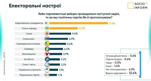 Якби парламентські вибори проводились найближчої неділі, то серед тих, хто визначився, найбільшу підтримку отримала б партія «Європейська Солідарність» — 34,5%, «Слуга народу» — 15,5%, «Голос» — 11,9%, «Самопоміч» — 8,6%, Громадянська позиція — 7%, ВО «Свобода» — 5%, ВО «Батьківщина» — 4,8%. Інші партії набирають значно менше прохідного бар’єру.